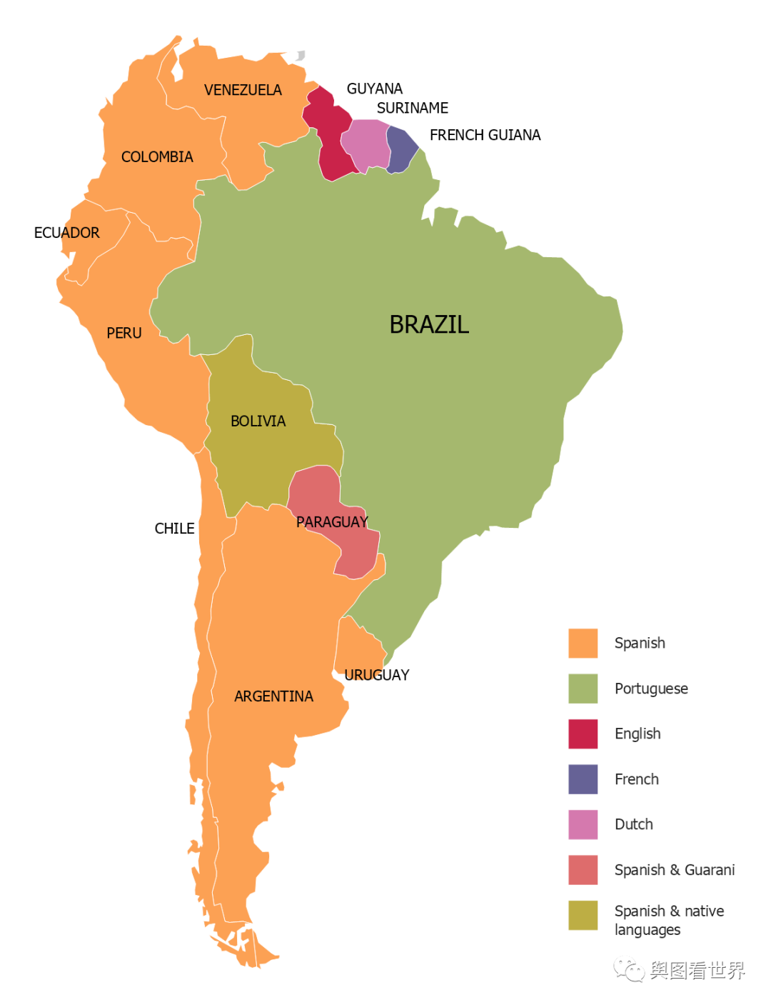 南美洲共有12个国家,以西班牙语为官方语言的国家有九个,以葡萄牙语为官方语言的国家有一个——巴西,以荷兰语为官方语言的国家有一个——苏里南,圭亚那是唯一一个以英语为官方语言的国家。自1814年荷兰将圭亚那转让给英国,直至1965年独立,圭亚那被英国统治了150年。