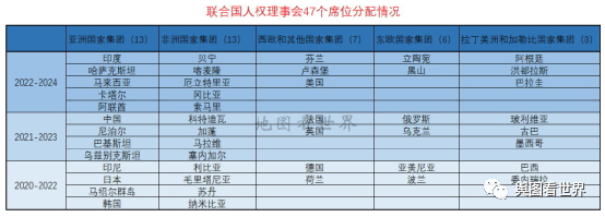 根据联合国大会相关决议,联合国人权理事会共由47个成员国组成,基于地域公平原则,47个席位中,非洲和亚太国家各占13席、东欧国家占6席、拉丁美洲和加勒比国家8席,西欧和其他国家7席。成员国由联合国大会经无记名投票选举产生,得票超过半数者直接当选(至少97票,即联合国会员国数量的一半),每届任期三年,连任两届后不可立即再次当选,每年改选三分之一左右的成员。