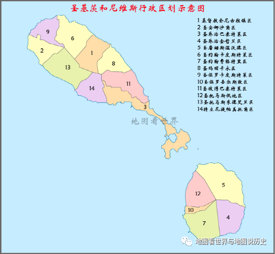 圣基茨和尼维斯全国共划分为14个教区(Parishes),其中9个在圣基茨岛,5个在尼维斯岛。