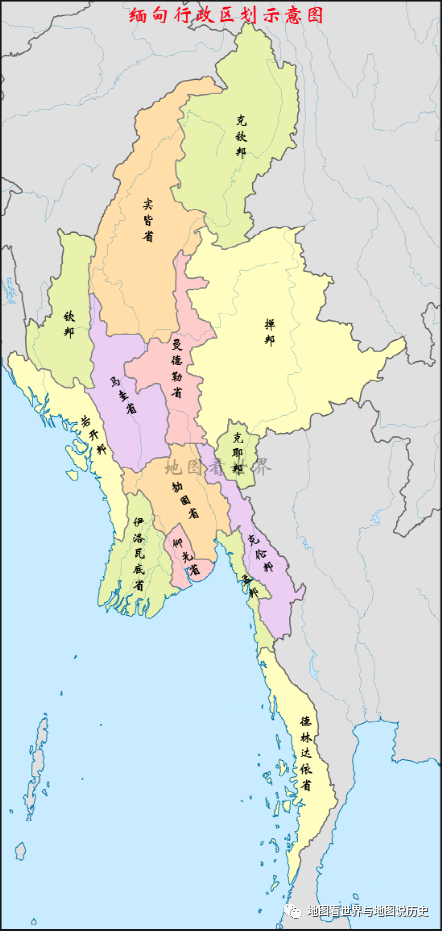缅甸全国划分为七个省、七个邦和联邦区;省是缅族主要聚居区,邦为各少数民族聚居地,联邦区是首都内比都。