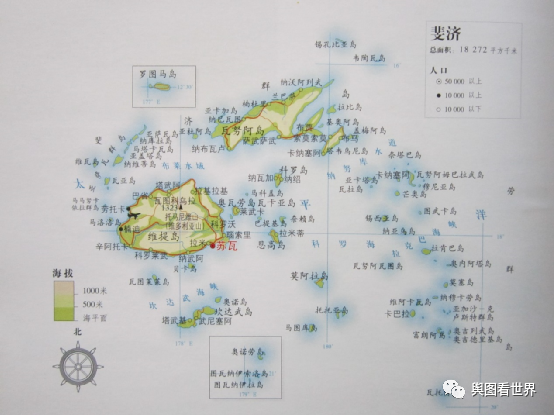 世界上197个国家中,只有三个国家被180度经线贯穿,斐济是其中之一,180度经线穿过斐济第三大岛——塔乌韦尼岛。塔乌韦尼岛上的180度经线标志牌已成为热门旅游景点,标志牌上写着“今天”(左)、“昨天”(右)、“新的一天由此开始”等字样。这里是理论上的国际日期变更线通过处,为避免一国出现两个日期,国际日期变更线已调整为从斐济东侧绕过。网传“斐济是一天中最早看到太阳的地方”是不对的,斐济比基里巴斯的莱恩群岛晚两个小时,莱恩群岛把时区调整为UTC+14。(3)专属经济区是陆地面积的70倍