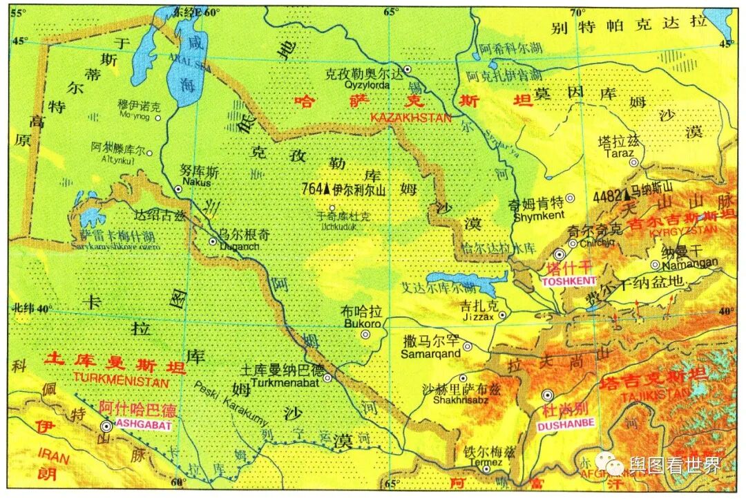 本文提到的中亚指狭义的中亚,即中亚五个“斯坦”——哈萨克斯坦、土库曼斯坦、乌兹别克斯坦、吉尔吉斯斯坦和塔吉克斯坦。“斯坦”源自波斯语地名后缀-stān,表示“家园”或“站立的地方”,与梵语sthāna(地方)、拉丁语stāre(站立)、status(地点)、英语stand(站立)、state(国家)都是同源词。