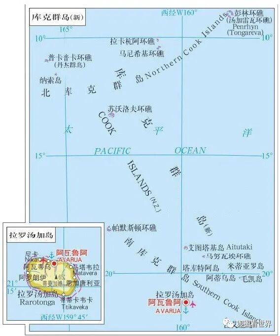 库克群岛(Cook Islands)位于南太平洋,属波利尼西亚岛群,由15个岛屿组成的群岛国家,面积236平方公里;2020年常住人口1.5万,另有约6.2万人居住在新西兰,均持新西兰护照。库克群岛存在感不强,知名度不高,许多人不知道它的存在,不少人以为只是一个群岛,而不把它当成国家。实际上,库克群岛是一个国家,这个国家的领土范围就是库克群岛。库克群岛不是联合国成员国,但与包括中国、法国、日本、德国、澳大利亚在内的50多个国家建立了外交关系。