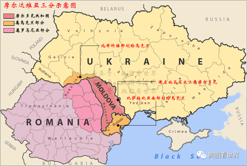 2006年,时任罗马尼亚总统的伯塞斯库表示“两德统一后,罗马尼亚是欧洲最后未统一的国家”,罗马尼亚总统口中的“未统一的领土”正是摩尔多瓦。1359年,波格丹一世推翻了匈牙利人的统治,建立了独立的摩尔达维亚公国,并把其疆域从喀尔巴阡山和普鲁特河之间的狭小区域,扩展到德涅斯特河和黑海边。16世纪初,摩尔达维亚和瓦拉几亚成为奥斯曼帝国的附属国。1812年,奥斯曼帝国将属于摩尔达维亚公国、位于德涅斯特河与普鲁特河之间的4.5万平方公里的领土割让给俄国,俄国将这里命名为“比萨拉比亚”。1878年,罗马尼亚公国在俄国支持下独立,领土包括原瓦拉几亚和摩尔达维亚,但不包括比萨拉比亚。一战结束后,作为战胜国的罗马尼亚,于1918年占领原奥匈帝国的布科维纳和俄国的比萨拉比亚,以及保加利亚的多不罗加,“大罗马尼亚”愿景得以短暂实现。1940年6月,苏联夺回比萨拉比亚和北布科维纳,并将比萨拉比亚南部和北布科维那划入乌克兰,比萨拉比亚剩余部分与摩尔达维亚自治共和国合并成立摩尔达维亚共和国,摩尔多瓦的疆域就此形成,延续成现在的摩尔多瓦共和国。