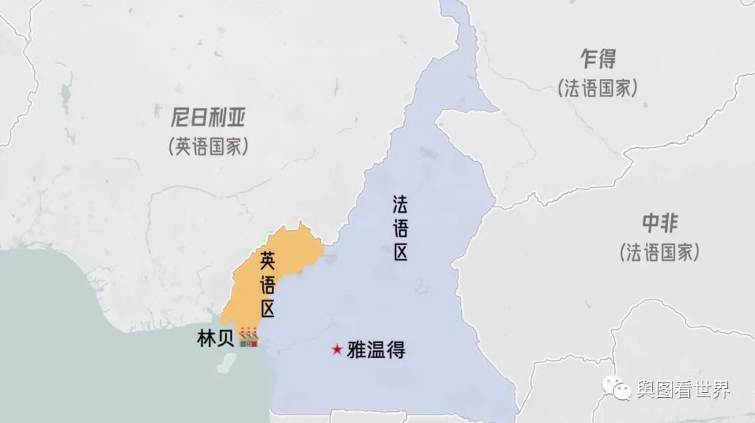 喀麦隆由前法国托管区和英国托管区构成,讲法语的居民占70%,讲英语的占30%,因此法语和英语同为官方语言。长期以来,英语区和法语区存在矛盾。英语区面积小、人数少,长期受到法语区歧视。
