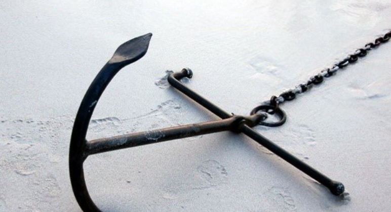 柯林斯:An anchor is a heavy hooked object that is dropped from a boat into the water at the end of a chain in order to make the boat stay in one place.