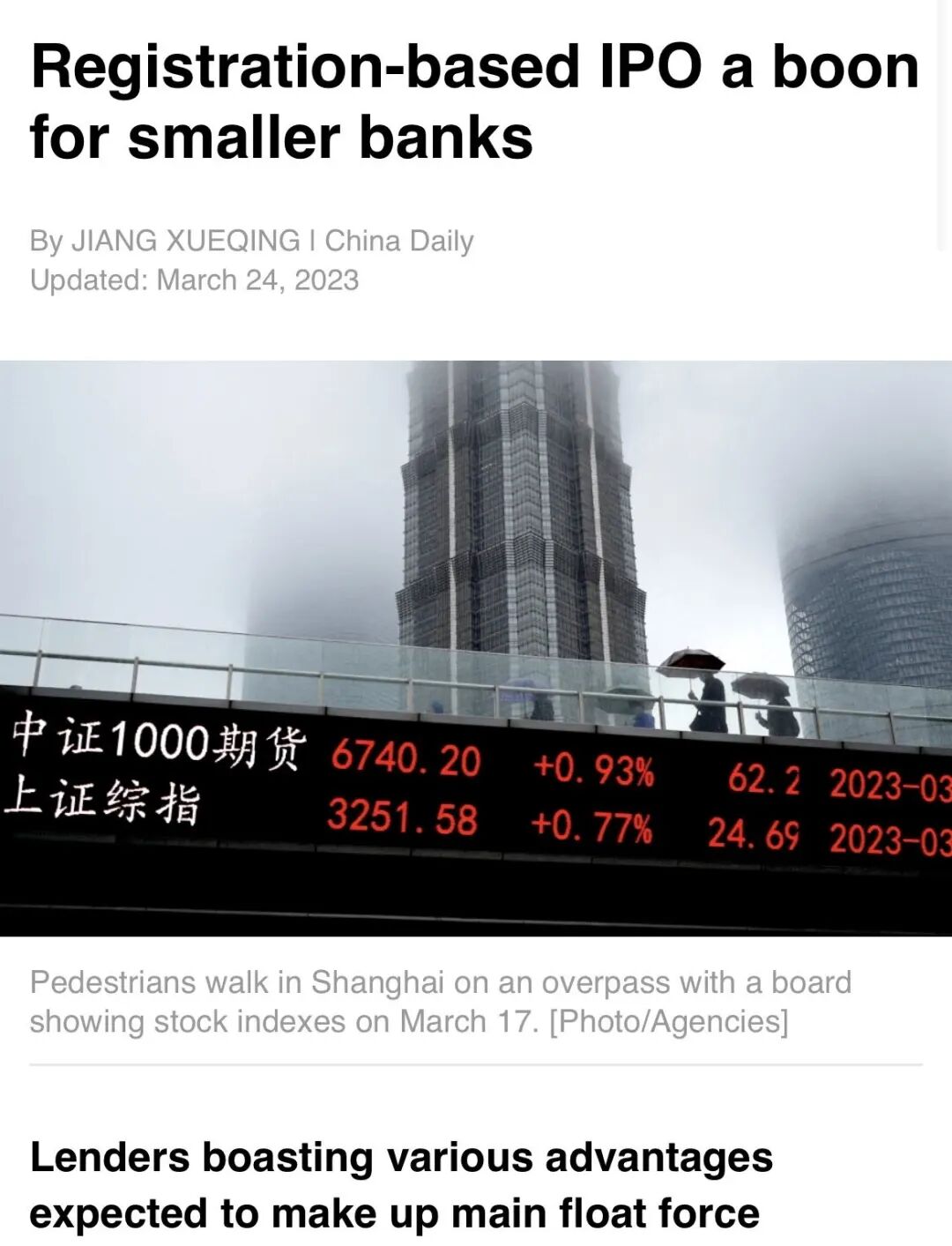 Registration-based IPO a boon for smaller banks就可以翻译成: 注册制上市(制度)对小银行来说是福音(利好)。