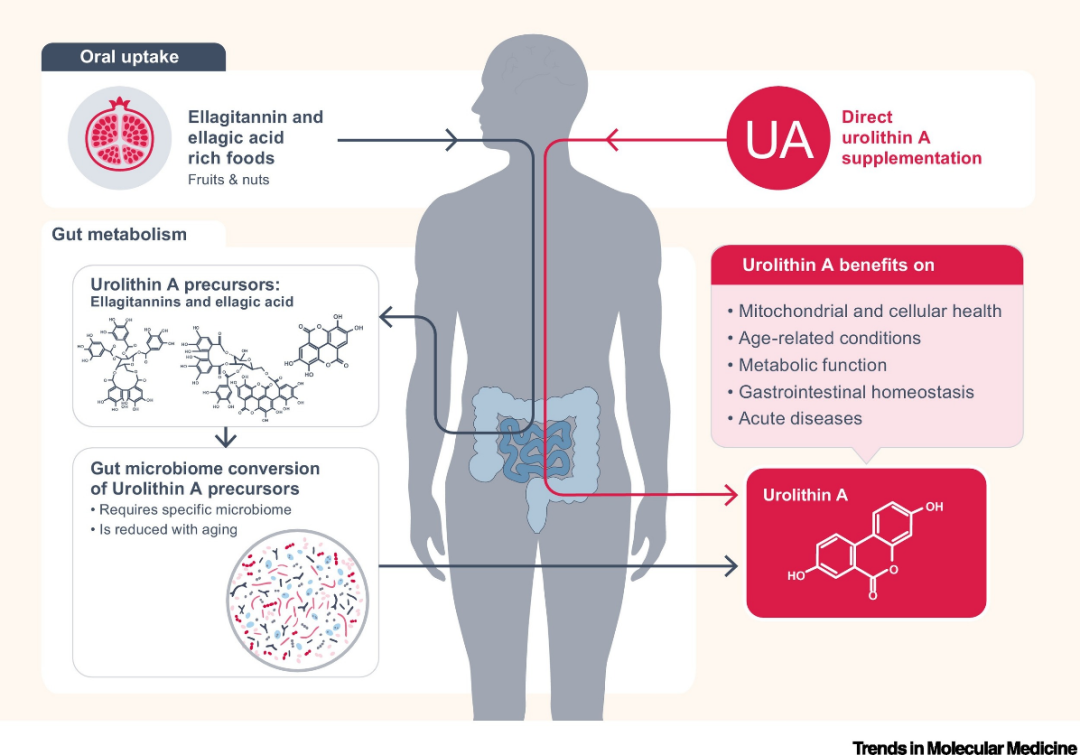 图注:尿石素A的前体鞣花单宁在通过食物摄入后经过肠道中的微生物菌群代谢成尿石素A [1]