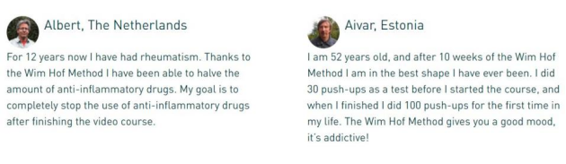 参与了课程的荷兰老伙计Albert反馈说,“我12年来一直患有风湿病,多亏了Wim Hof才能够让消炎药用量减半”;爱沙尼亚52岁的Aivar则感叹到“使用Wim Hof法10周后,我的体型达到了前所未有的最佳状态。学之前只能做30个俯卧撑,学完后第一次做到了100个!”