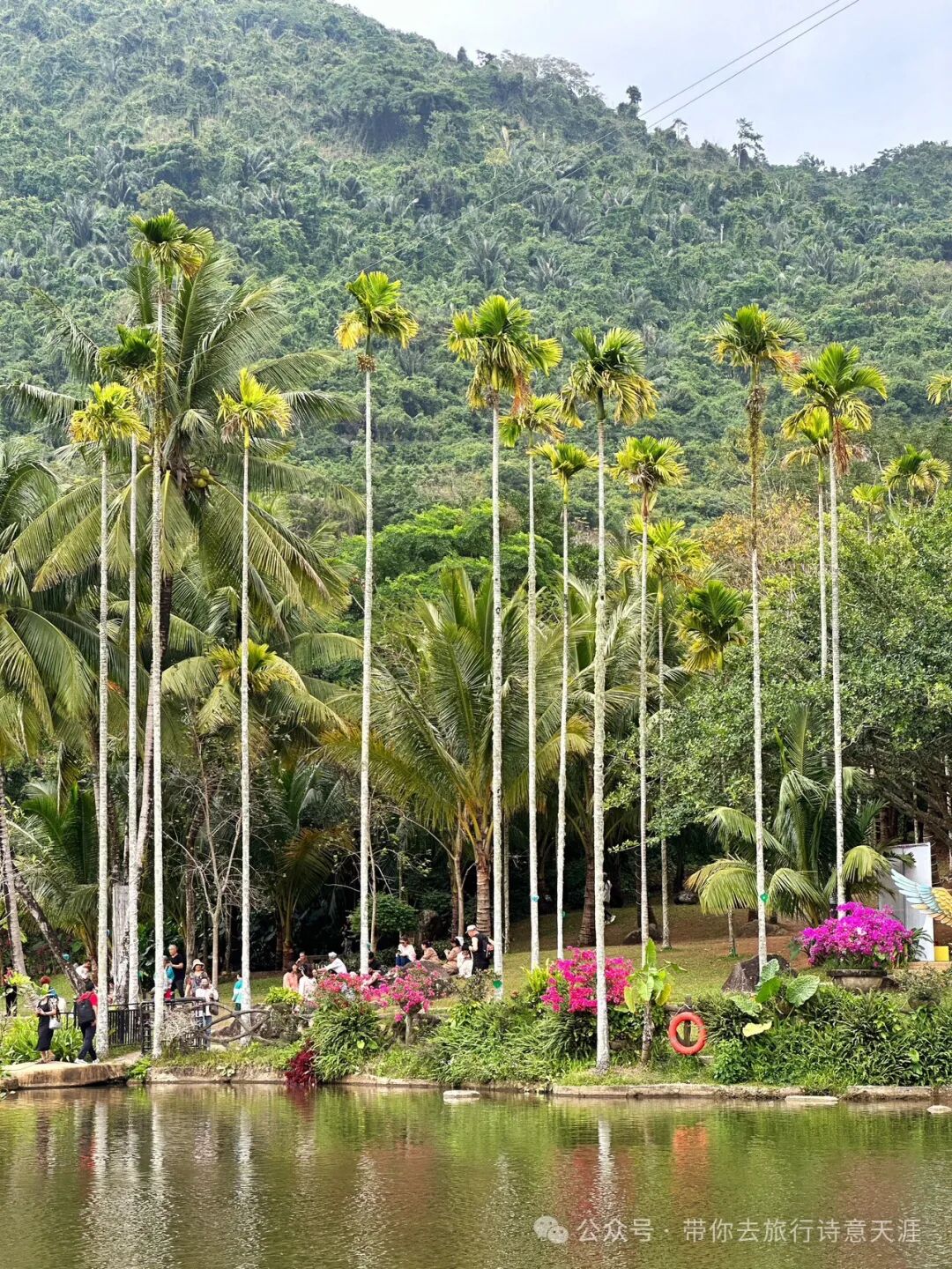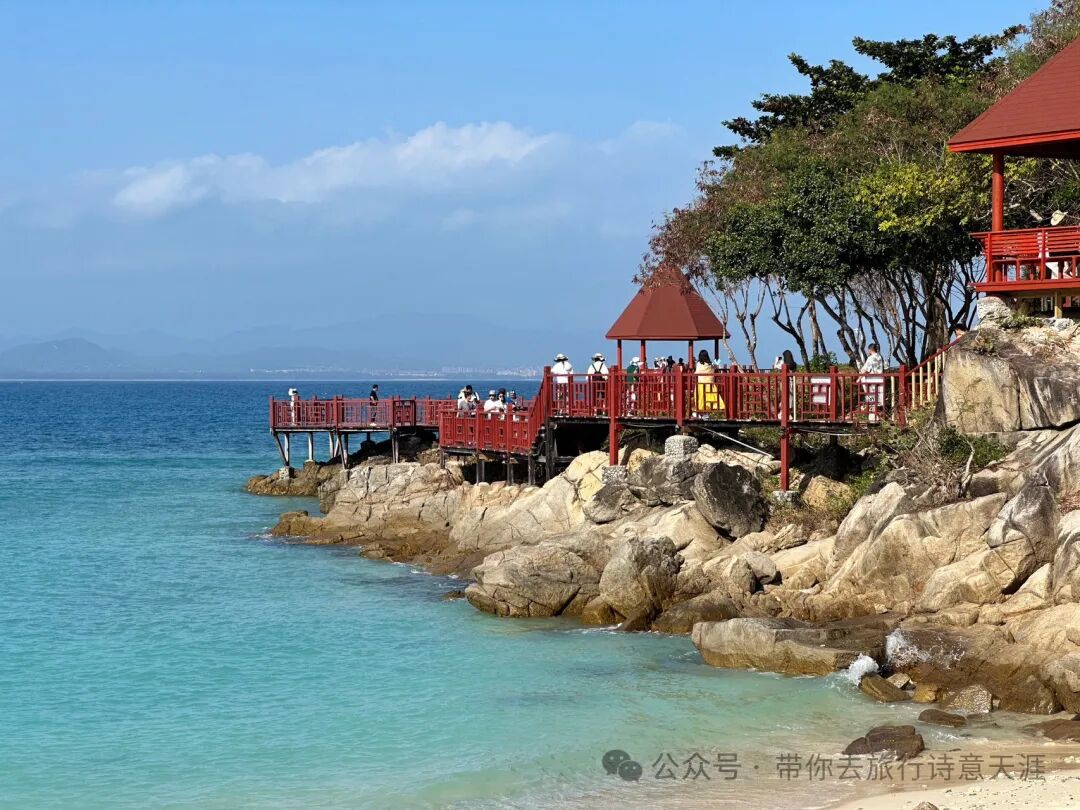 题诗《呀诺达热带雨林景区》:索桥百米过三门,罗汉竹节佛肚寻。梦幻谷中孤影去,槟榔树下坐黄昏。5.亚龙湾亚龙湾,位于三亚市东南,是海南最南端的一个半月形海 湾,全长约7公里,被誉为“天下第一湾”。