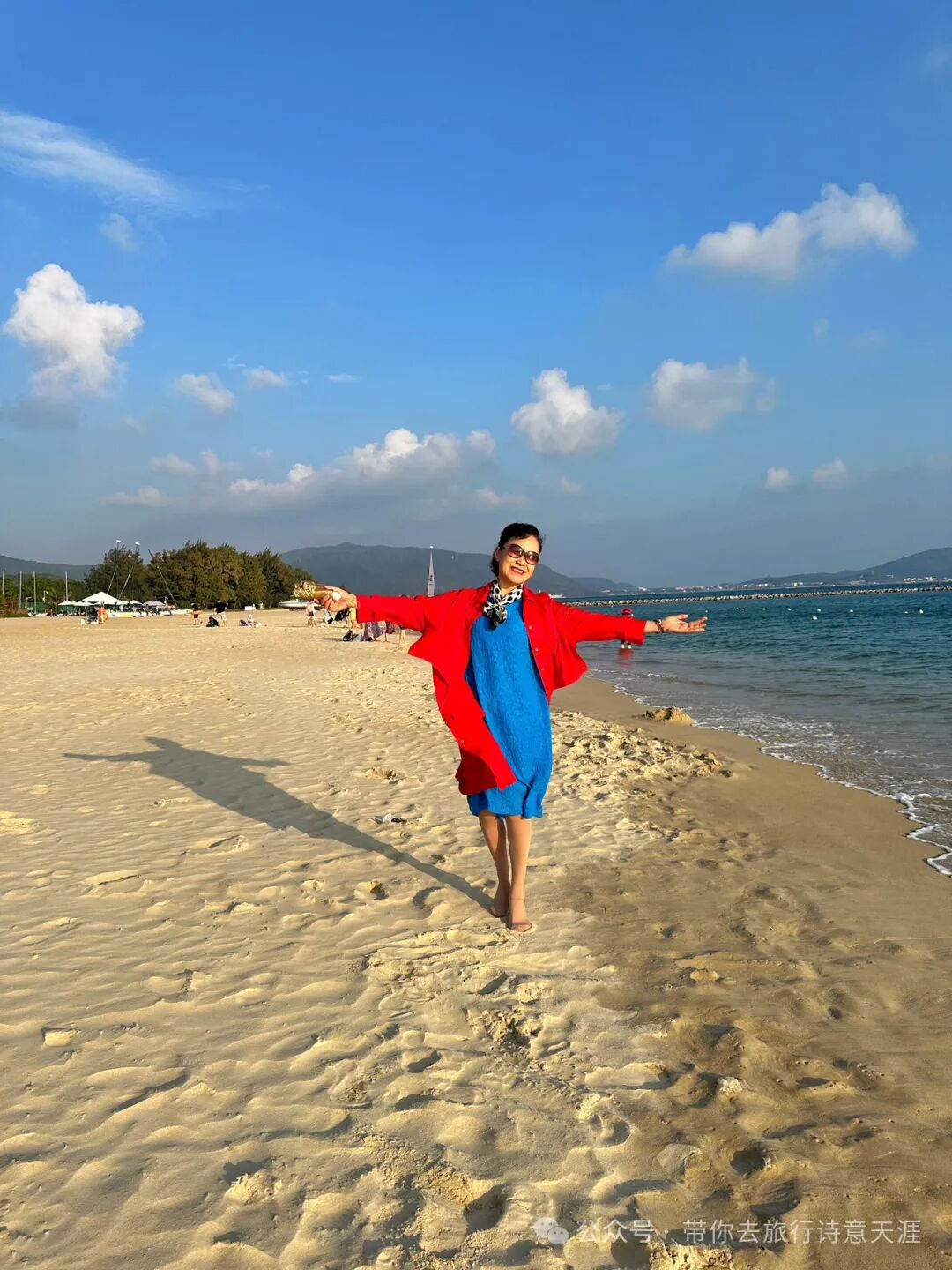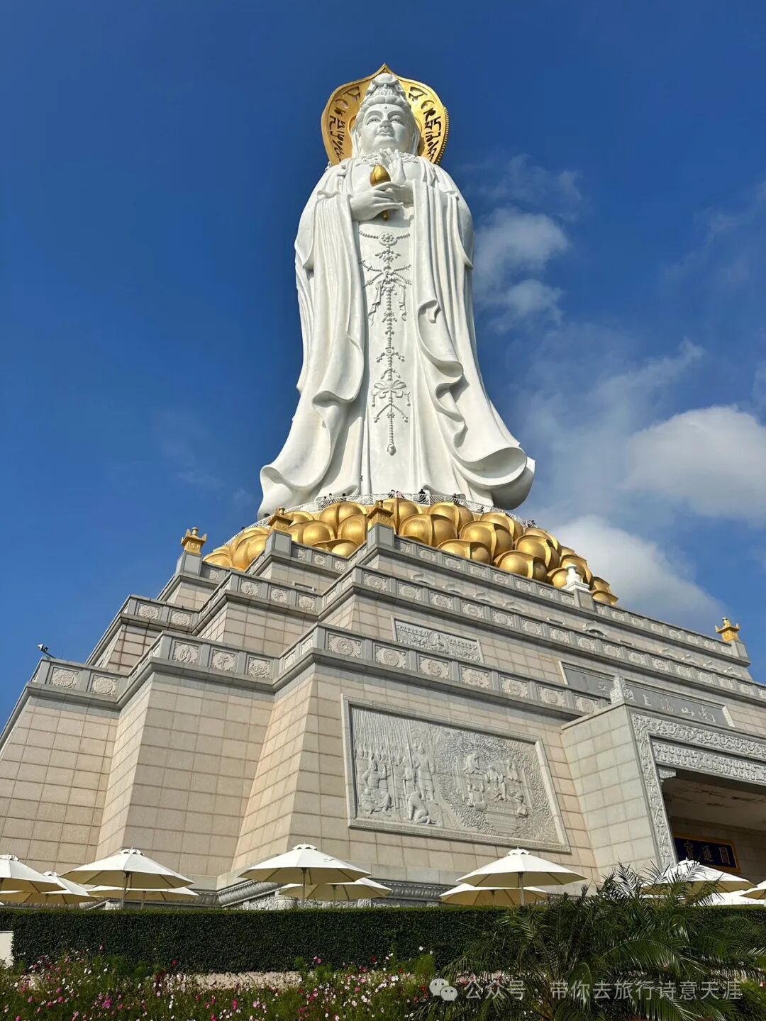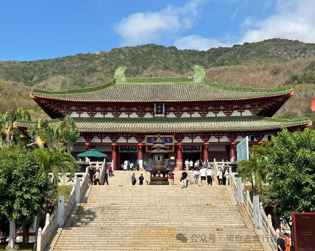 题诗《亚龙湾》:快艇飞驰破浪冲,深潜海底过礁丛。何如携手夕阳下,漫步沙滩听海声。6.南山海上观音、南山寺南山佛教文化园,位于三亚市西南的南山脚下,园内主要建筑有南山海上观音、南山寺等。南山海上观音,一体化三尊造型,从三面看都是一尊独立完整的观音像。环绕一周方可看清三尊观音像全貌,手持法器分别为莲花、佛珠、经书。