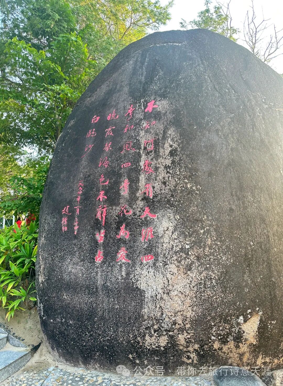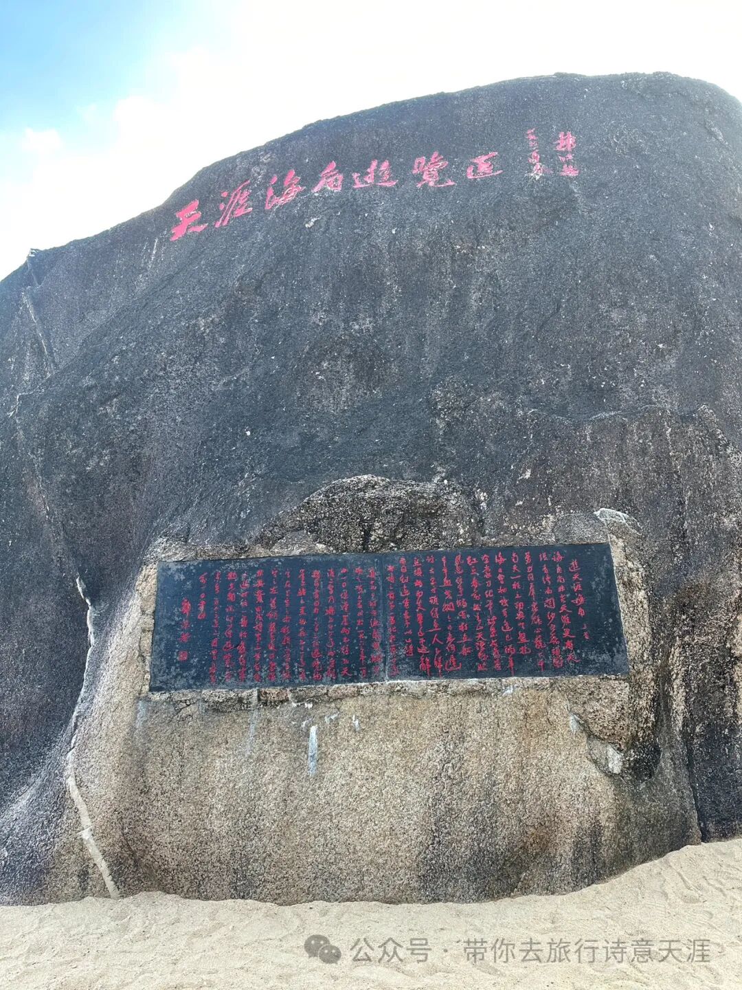 郭沫若先生在“天涯”石的另一侧,题写“天涯海角游览区”,之下为其题诗。1961年2月4日,郭沫若游览天涯海角时,看见附近的马岭村(今天涯区马岭居委会)渔民在海滩上捕鱼,便兴致勃勃地卷起衣袖和裤脚,与渔民一起拉网。之后郭沫若赋诗:海角尚非尖,天涯更有天。波青湾面阔,沙白磊头圆。劳力同群众,雄心藐大千。南天一柱立,相与共盘旋。
