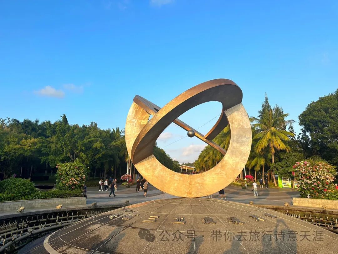 天涯海角星,不锈钢制作,三个圆弧分别代表“子午环”、“赤纬环”、“赤经环”;环中心的一颗水晶制星体代表“天涯海角星”。雕塑底座刻有“美丽三亚浪漫天涯”,水池的周边24只蟾蜍,代表天球赤道坐标系中赤经环的 “24时”刻度和农历24节气。