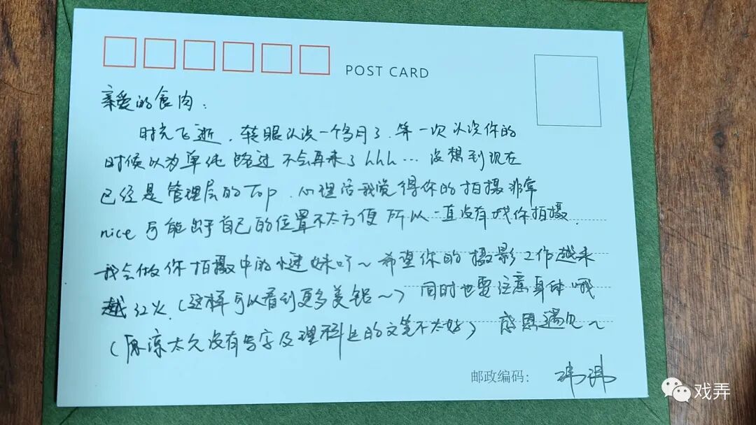 拆开后,首先看到的是茶颜悦色的茶包和小物件,因为我就在长沙,惊喜并不多,但也还是会觉得是用了巧思的——不贵重但别致;然后就看到了一个信签,拆开后是她的照片明信片、就看到了后面的文字: