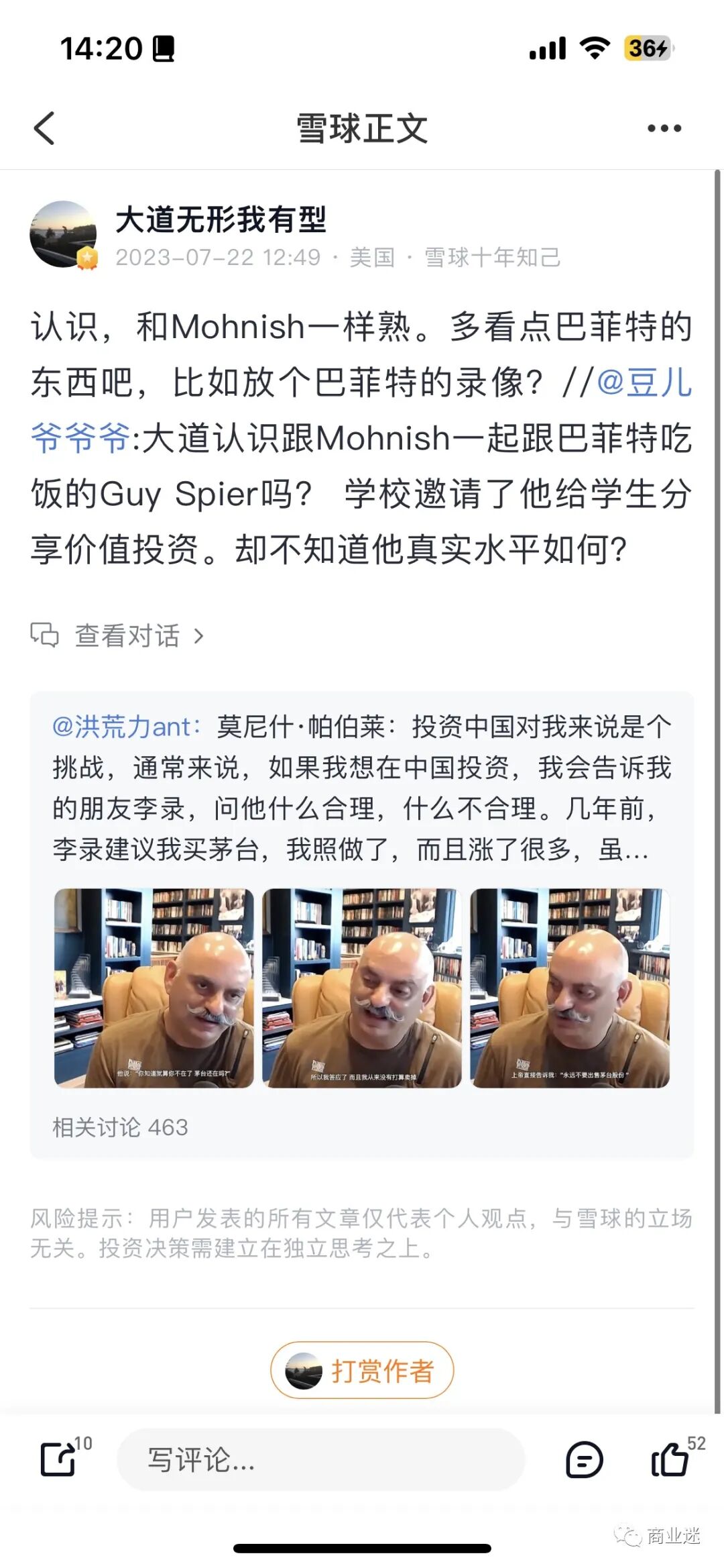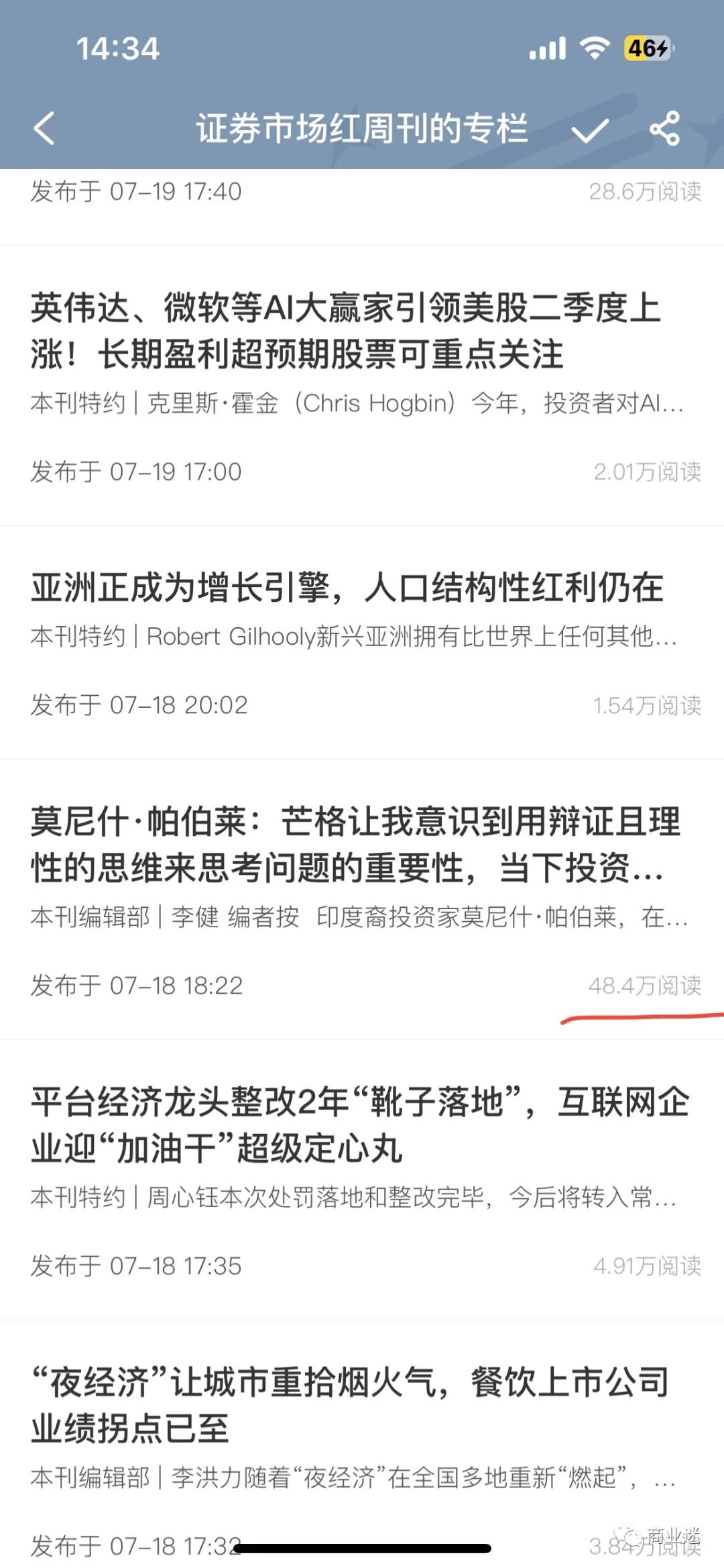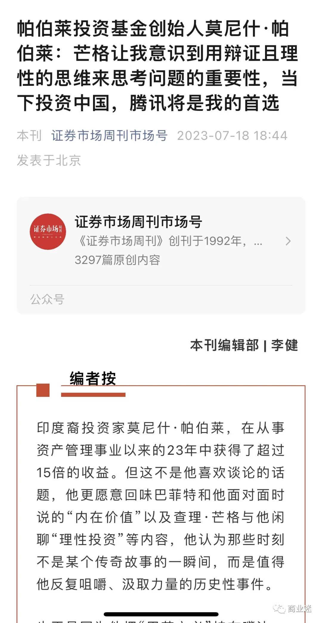 事情是这样的,7月18号《证券市场周刊》发布了一篇帕伯莱的访谈,也同步发到了雪球。在雪球上这篇文章引发了很多的阅读和讨论,截止此刻,文章收获了48.4万阅读和144条评论和212条转发。
