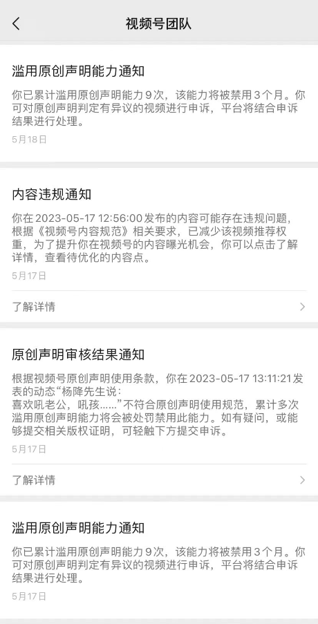 在创作分成计划推出后,我那个视频号也收到了《创作分成计划》的开通邀请,但是随之而来的就是一连串的违规处罚通知了。