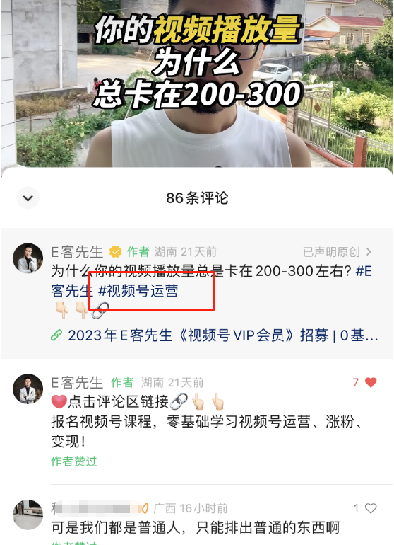 比如我点击 #视频号运营 这个标签,然后就能打开平台上,几乎所有加了 #视频号运营 这个标签的视频。