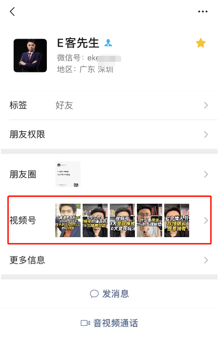 如果他开启了视频号展示在个人微信资料页的这个入口,那么我们就可以通过视频号进一步了解到这个人更多信息。