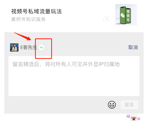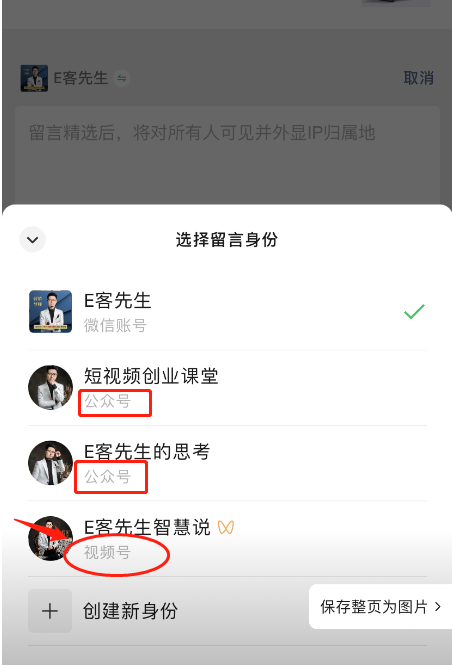 以前只能是我们个人微信身份留言,现在可以切换成公众号身份,还能切换成视频号身份。