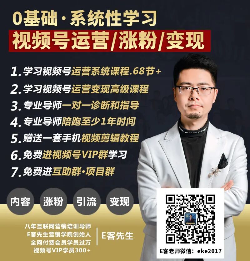 我是E客先生,做了8年互联网营销培训,今年聚焦视频号赛道,目前在做视频号运营涨粉和变现培训。