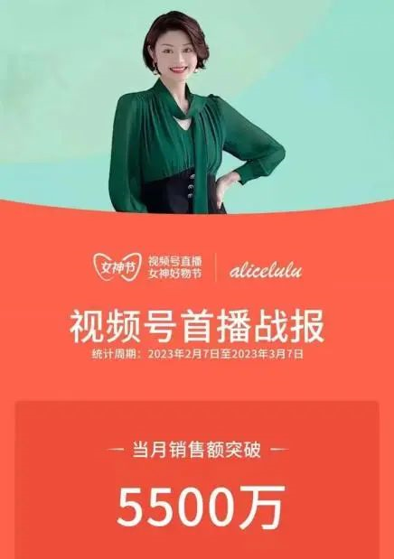 在视频号这个赛道上也涌现出很多黑马,比如像做女装的爱丽丝团队,今年2月份在视频号开播,一个月斩获5500万的销售额,据团队运营总监分享,他们平均每场直播都能做到几百万的GMV。