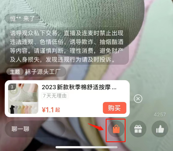 6,直播正式开播,就能看到直播间底部的购物袋里面,有我们已添加的商品,以及产品弹出展示的气泡,主播介绍并引导直播间粉丝购买直播间底部弹出的商品;