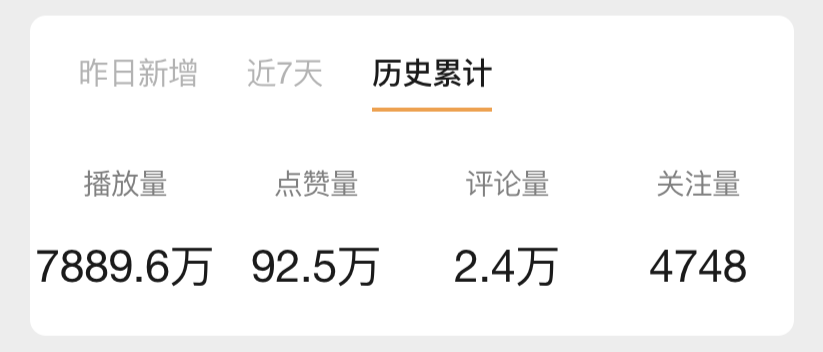 这个地方就能显示出我们整个视频号,从你发布的第一条视频到当前为止,总共的历史播放量、点赞量、评论量、关注量。