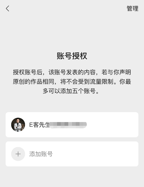 授权账号后,该账号发表的内容,若与你声明原创的作品相同,将不会受到流量限制。你最多可以添加五个账号。