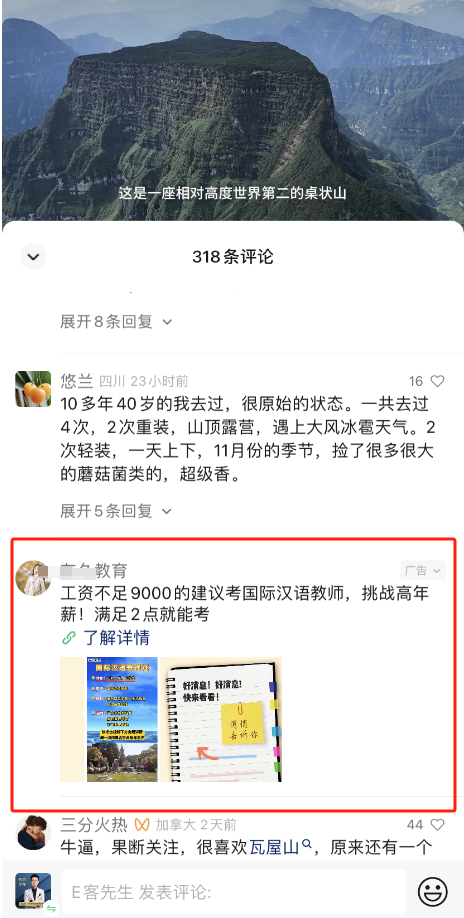 基本上发一段时间,系统就会发一条邀请通知过来,邀请你开通权益,你开通后,每条视频勾选原创,系统自动匹配的广告,就会展示在你的视频评论区。