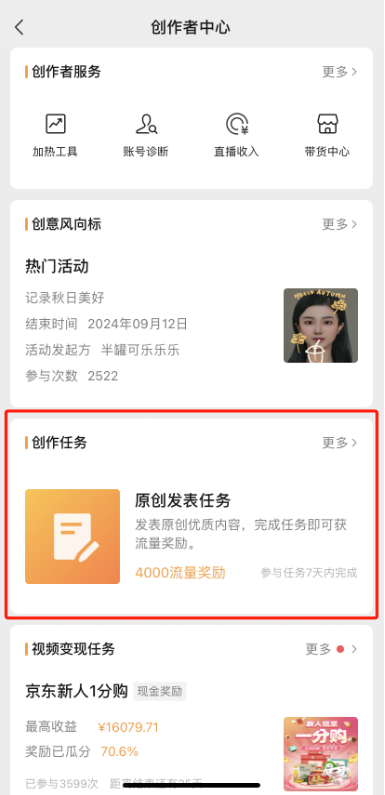如果你的视频号后台,没有这个创作任务,就只能耐心等待,多发原创视频,系统会给你推荐这个任务的。
