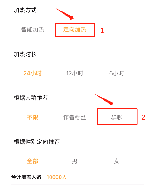 就是你在给你到短视频加热投流的时候,点击【加热方式】,然后选择【定向加热】,里面多了一个【群聊】选项。