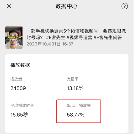 最近,视频号数据多了一个新功能—3秒以上播放率。