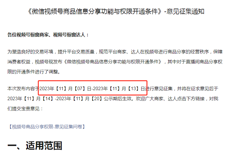 这个文件是视频号官方11月7日发布的,目前属于意见征集阶段,并未正式实施!