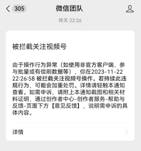 就因为互粉关注视频号太频繁,导致被系统拦截了。如果持续操作,可能导致更加严重的违规处罚。