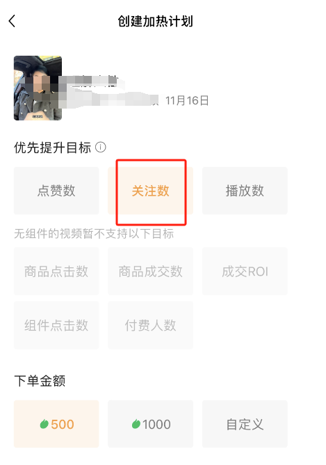 就是用微信豆加热你的短视频,在优先提升目标那里,我们直接选择“关注数”。