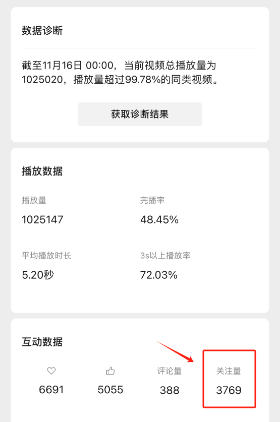 比如我就用这个思路和方法,做了一条视频,播放量100万+,涨粉3700+。