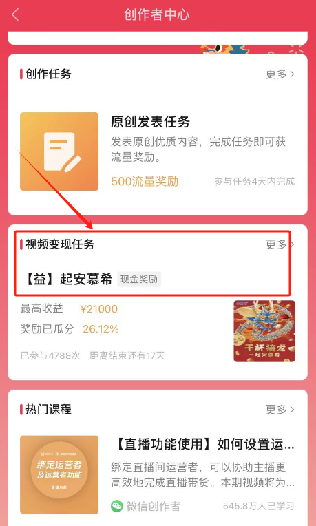 进入到视频号后台,创作者中心,页面下面有一个【视频变现任务】,然后里面有一个【益】起安慕希的一个活动。