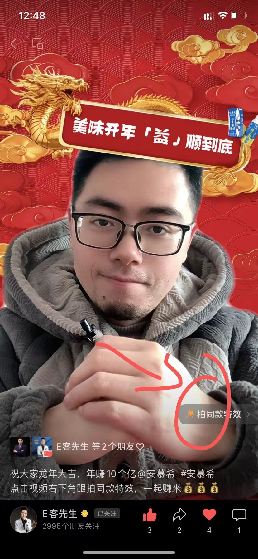 如果你们找不到那个入口,或者觉得麻烦,可以直接点击我的视频右下角,有一个“拍同款特效”入口。