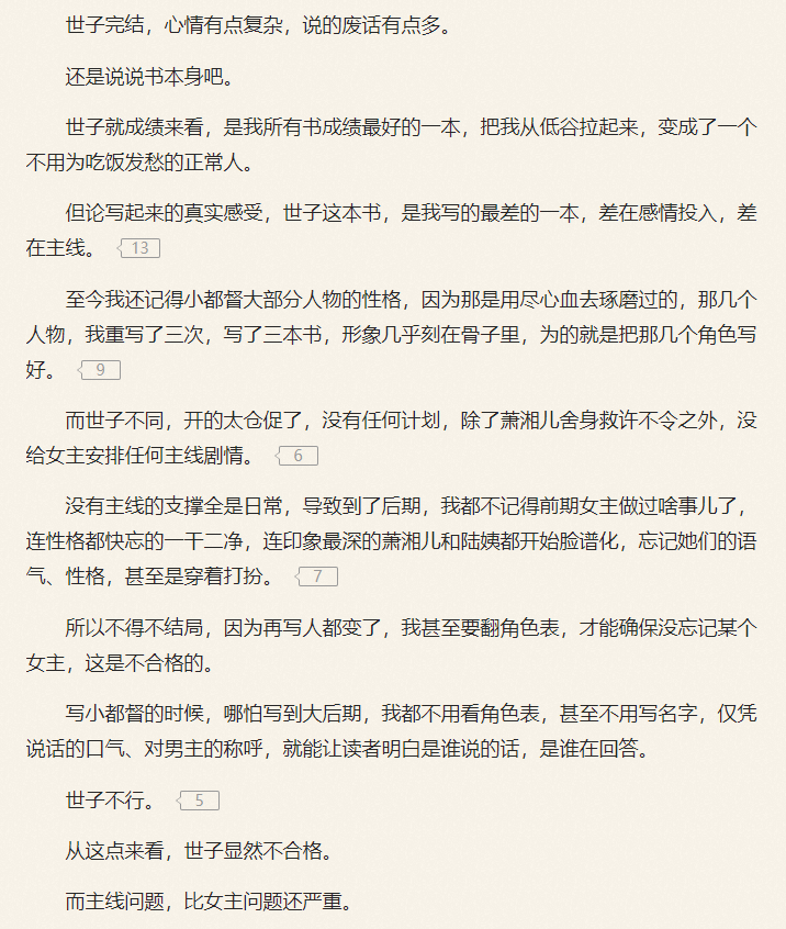 但实际上作者在完结感言里却一再表示,这书其实他相当不满意,当初上架时成绩只有1300暂且不说,后续很多地方的描写,特别是人物描写都相当的单薄,主线剧情也不够深入,感情投入也比较差,但最终成绩却是他写得几本书里最好。(我也想这样凡尔赛一回