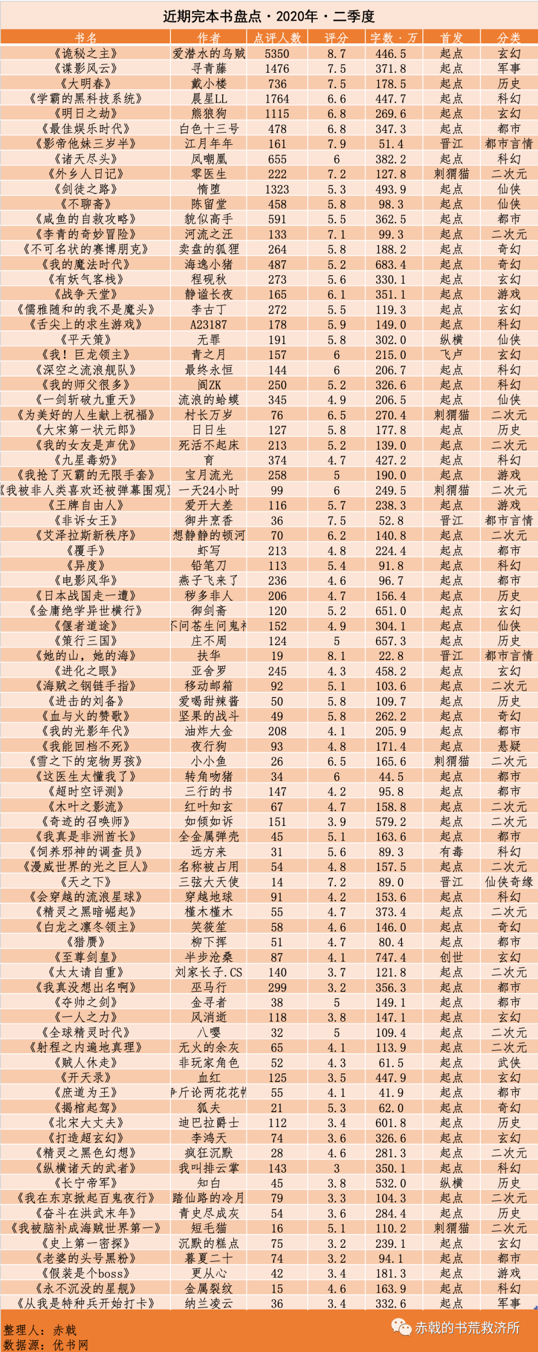 这次仍然以时间为界限,将2020年第二季度(4月到6月)的所有完本书(赤戟收录到的,完本的时间范围可能有一定出入,以在赤戟这里入库时间为准),进行榜单式汇总,然后分类细评。