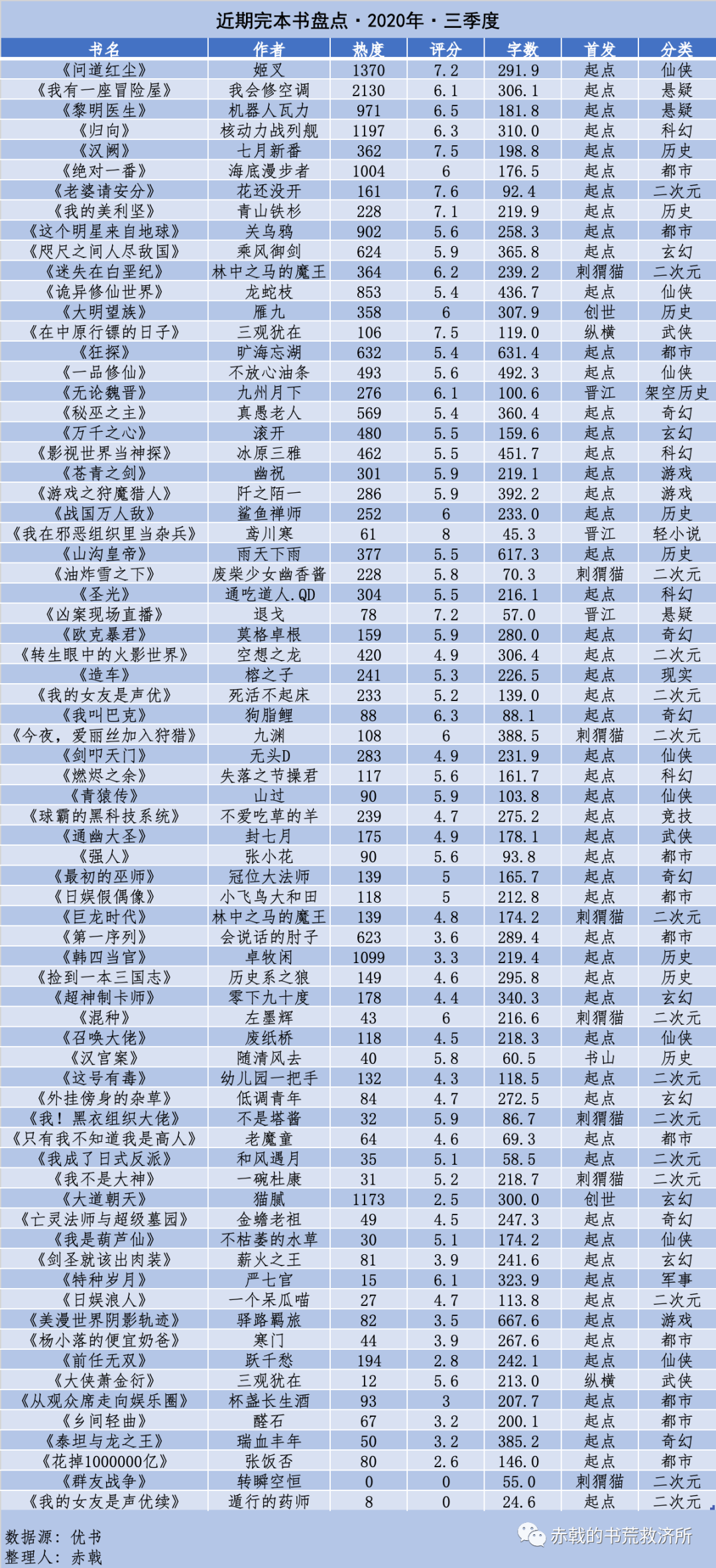 这次仍然以时间为界限,将2020年第三季度(7月到9月)的所有完本书(赤戟收录到的,完本的时间范围可能有一定出入,以在赤戟这里入库时间为准),进行榜单式汇总,然后分类细评。
