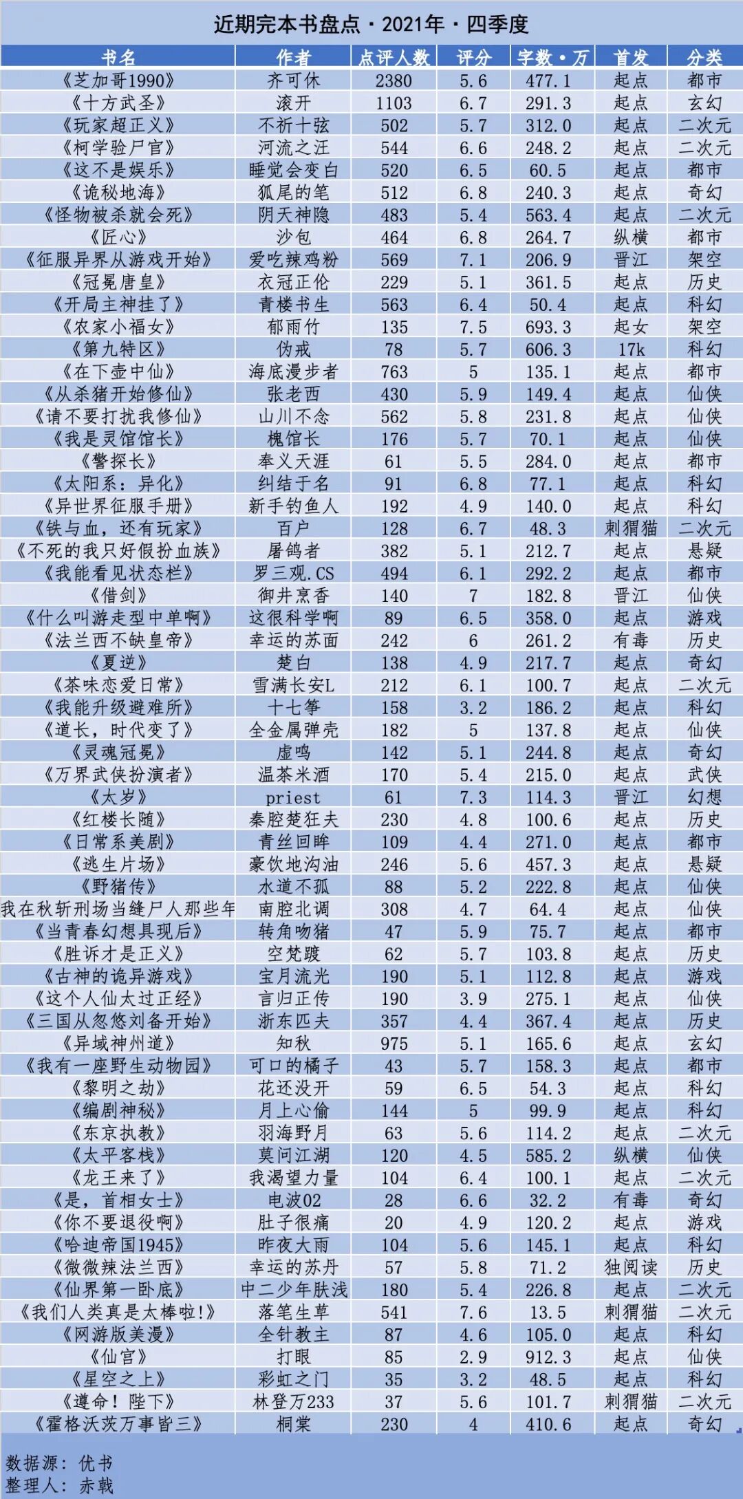 以时间为界限,将2021年第四季度(10月到12月)的所有完本书(赤戟收录到的,完本的时间范围可能有一定出入,以在赤戟这里入库时间为准),进行榜单式汇总,然后分类细评。