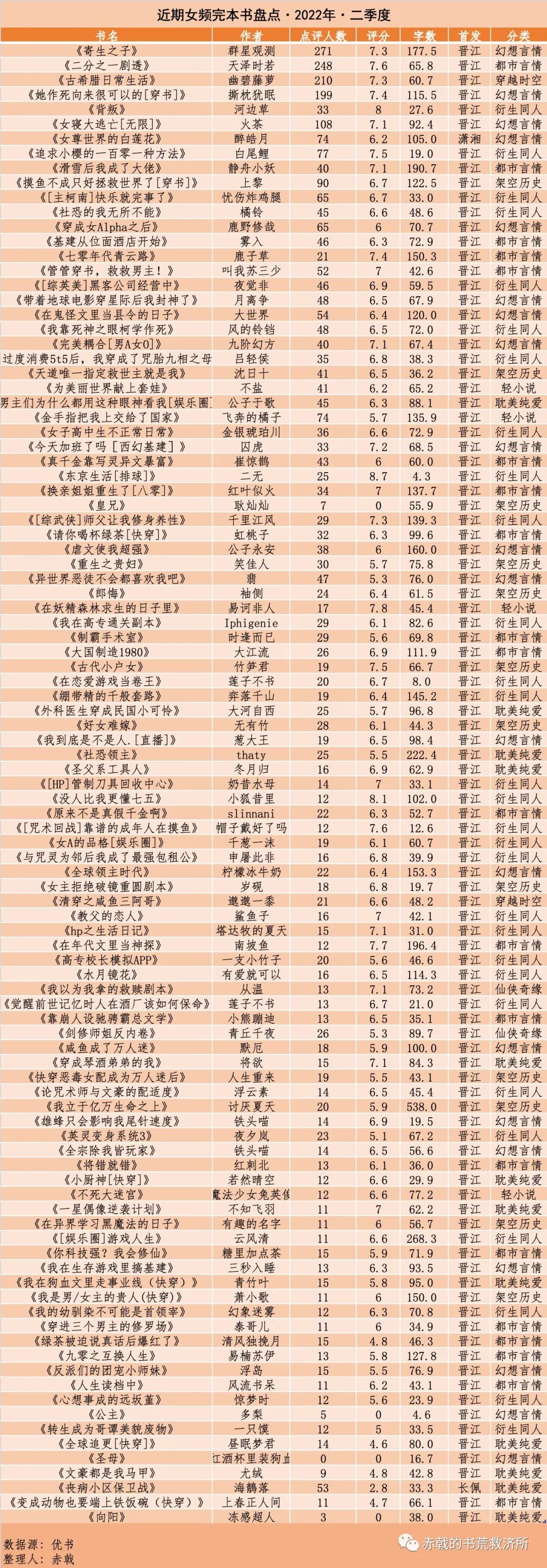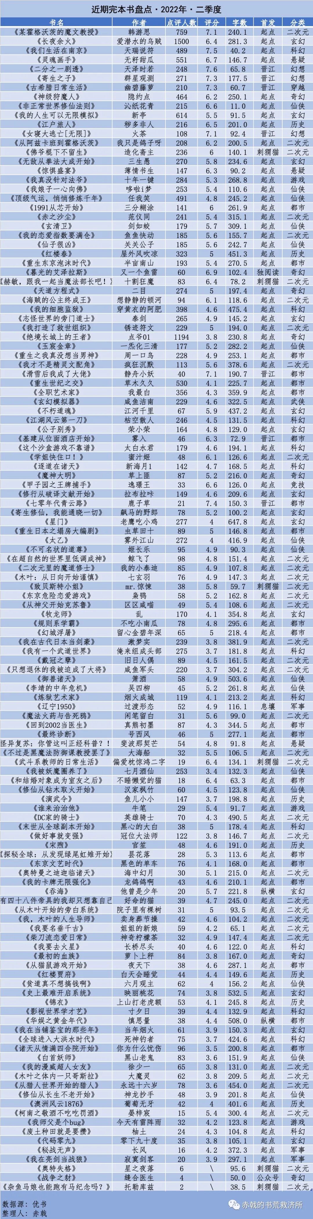 以时间为界限,将2022年第二季度(4月到6月)的所有完本书(赤戟收录到的,完本的时间范围可能有一定出入,以在赤戟这里入库时间为准),进行榜单式汇总,然后分类细评。