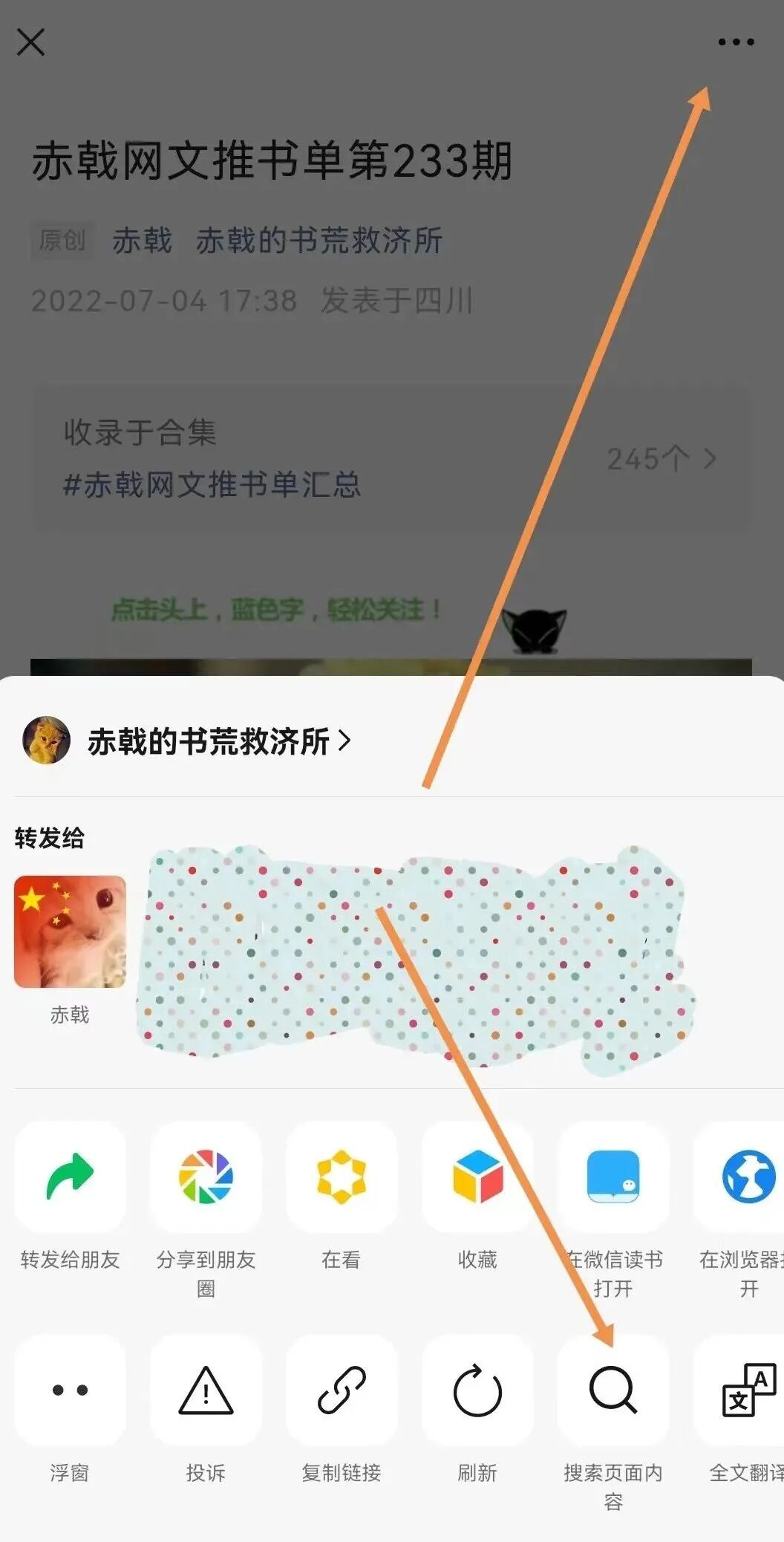 点击进入文章,然后点击右上角的省略号,即可弹出选项,选择“搜索页面内容”,这个就是页内搜索功能: