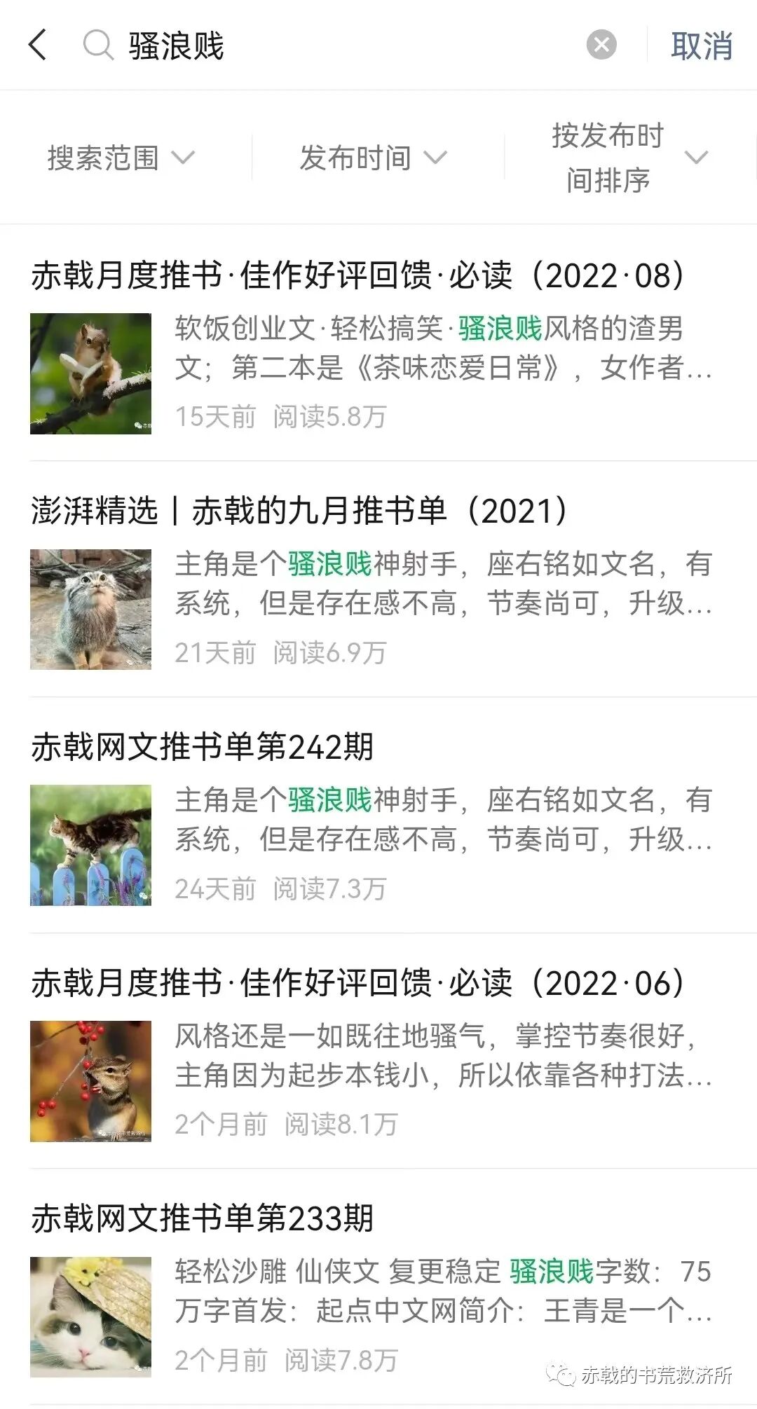 第三步:在箭头所指的搜索框里,键入所有你想试的关键词,比如:“骚浪贱”,你能找到很多推荐这类风格作品的文章,可以调整搜索范围和发布时间,我们按发布时间排序,结果如下: