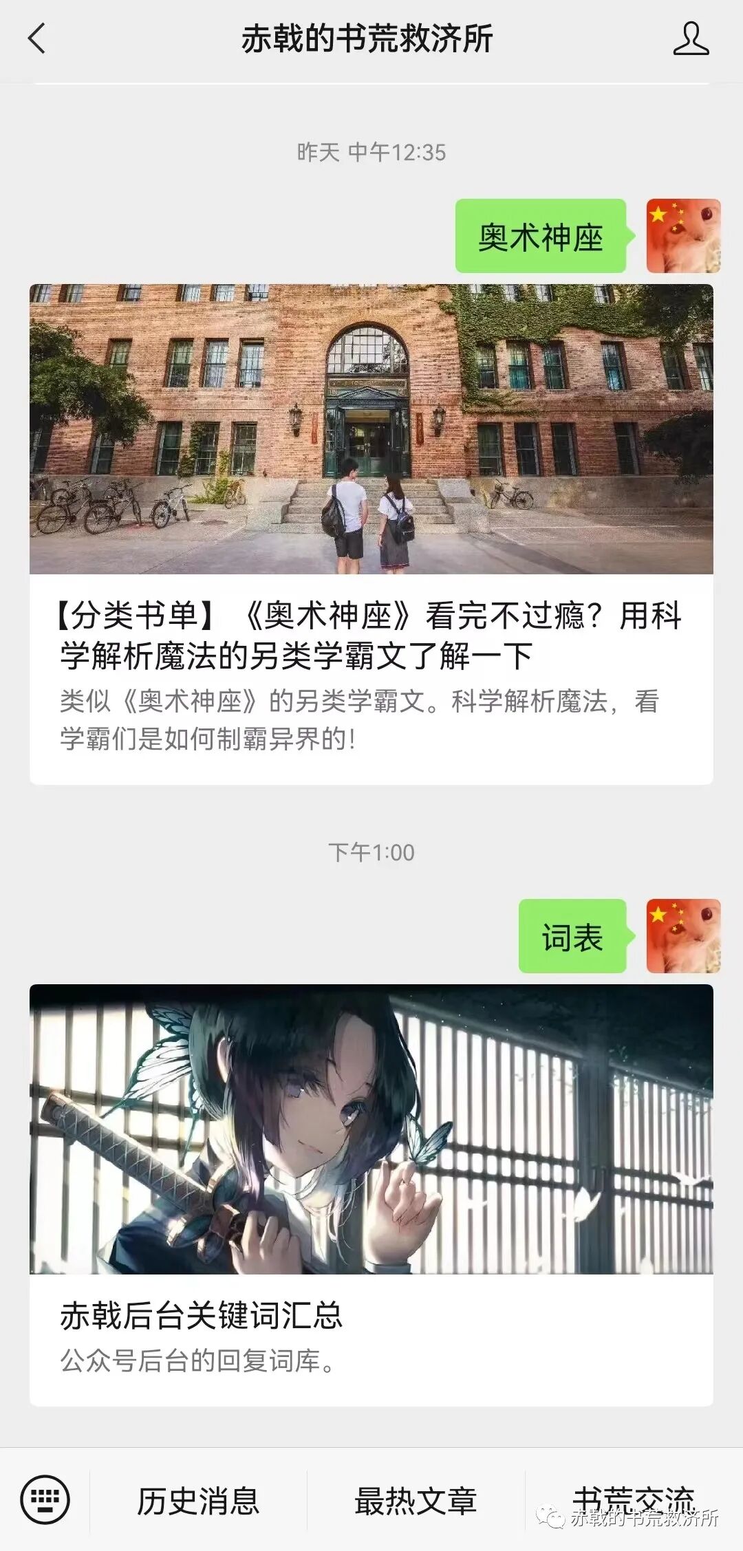 很多书友喜欢根据关键词来查找偏好的作品,比如“模拟器,第四天灾”等等,所以赤戟专门在后台配置了几百个分类盘点的文章来满足广大书友们的找书需求,只要你在公众号的对话框(发消息)里输入相应的分类词语,就会返回赤戟专门配置的分类盘点文章,比如这种: