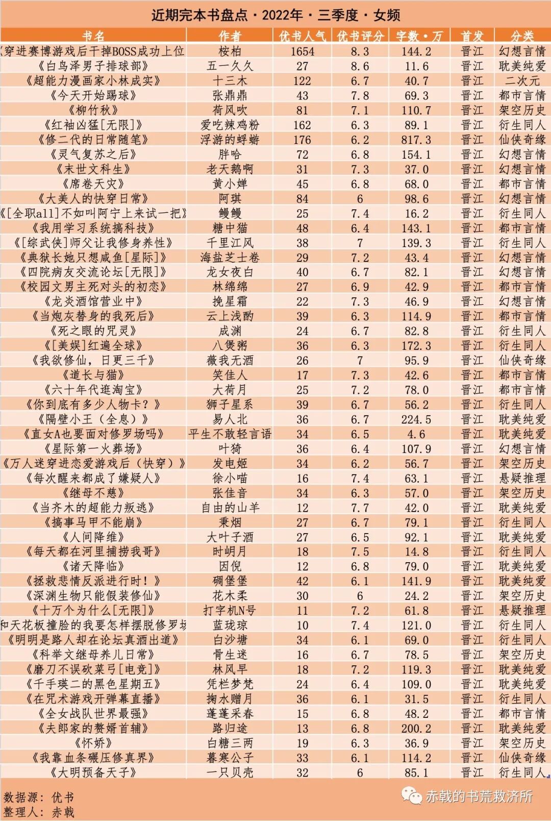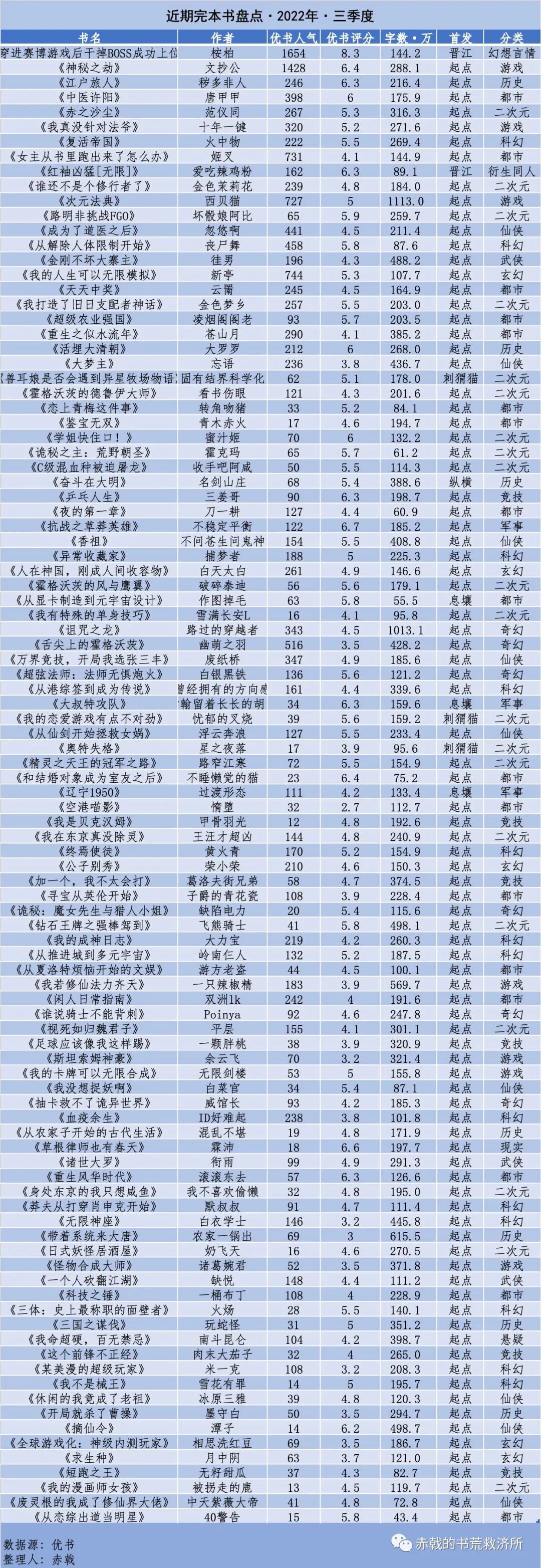 以时间为界限,将2022年第三季度(7月到9月)的所有完本书(赤戟收录到的,完本的时间范围可能有一定出入,以在赤戟这里入库时间为准),进行榜单式汇总,然后分类细评。