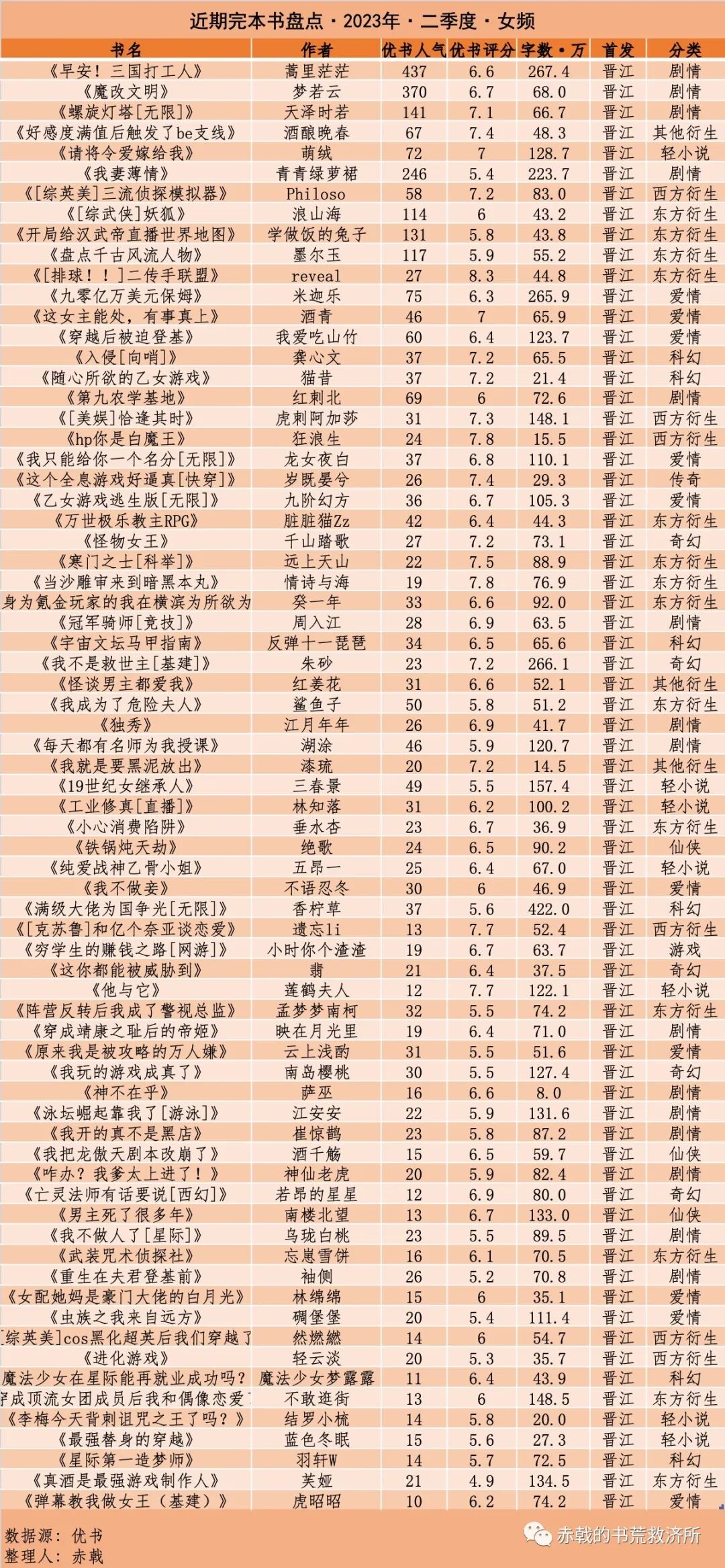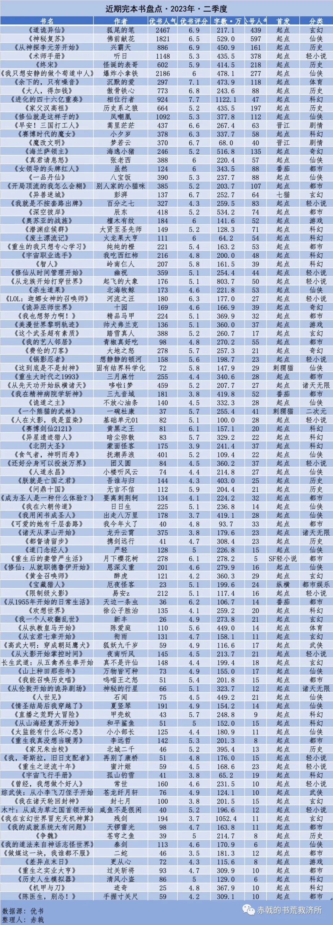 以时间为界限,将2023年第2季度(4月到6月)的所有完本书(赤戟收录到的,完本的时间范围可能有一定出入,以在赤戟这里入库时间为准),进行榜单式汇总,然后分类细评。