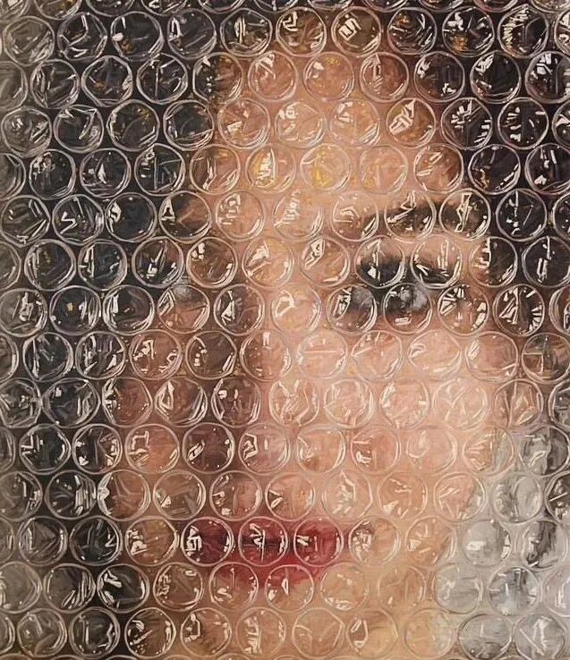 在这之前,他也尝试过在人物脸上放各种面具,如毛线帽、水流、镜面等,到最后他才找到一种最难的,也是最舒适的创作方式,那就是塑料泡泡膜!