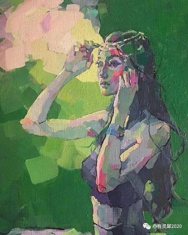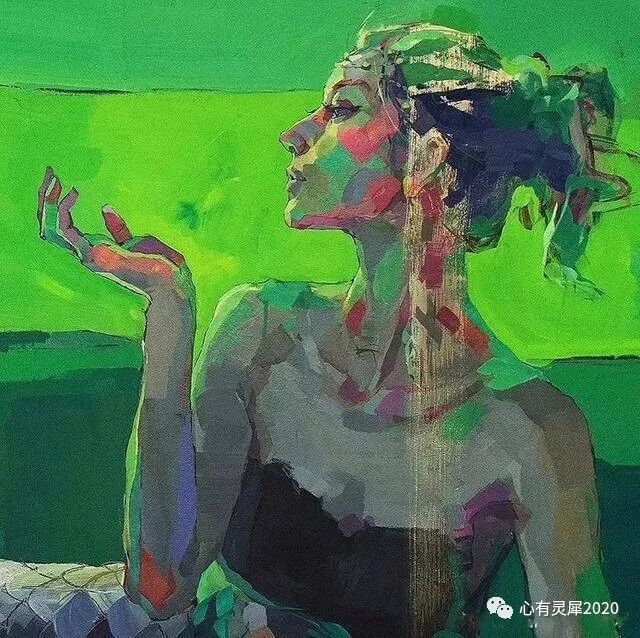 欣赏这位女画家笔下五颜六色的大色块,虽然色彩斑斓模模糊糊,不是写实油画,但正是这种朦胧中的美态,更完美地表达出了这些女性们的心声,喜怒哀乐,情真意切!